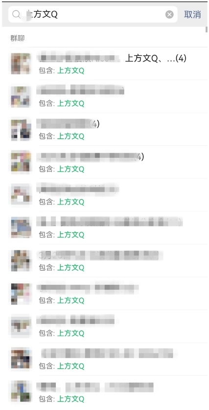 只需要在微信首頁搜索框輸入自己的昵稱,然后在搜索結(jié)果的群聊部分,點(diǎn)擊“更多群聊”,就可以一覽無余了。