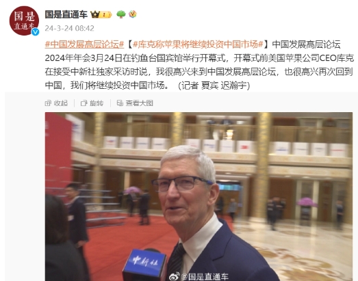 中國發(fā)展高層論壇 2024 年年會 3 月 24 日在釣魚臺國賓館舉行開幕式,開幕式前美國蘋果公司 CEO 庫克在接受采訪時表示,“我很高興來到中國發(fā)展高層論壇,也很高興再次回到中國,我們將繼續(xù)投資中國市場。”