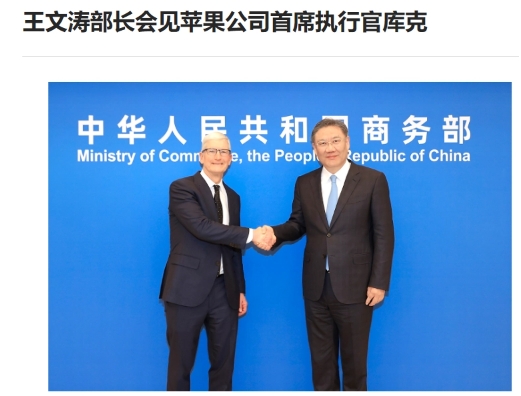 3 月 22 日,商務(wù)部部長王文濤會見美國蘋果公司首席執(zhí)行官庫克。雙方就蘋果公司在華發(fā)展、中美經(jīng)貿(mào)關(guān)系等議題進(jìn)行了交流。庫克表示,中國人才資源豐富、創(chuàng)新活力強(qiáng),是蘋果公司的重要市場和關(guān)鍵供應(yīng)鏈伙伴。蘋果公司將繼續(xù)致力于在華長期發(fā)展,持續(xù)加大對中國供應(yīng)鏈、研發(fā)和銷售的投入。