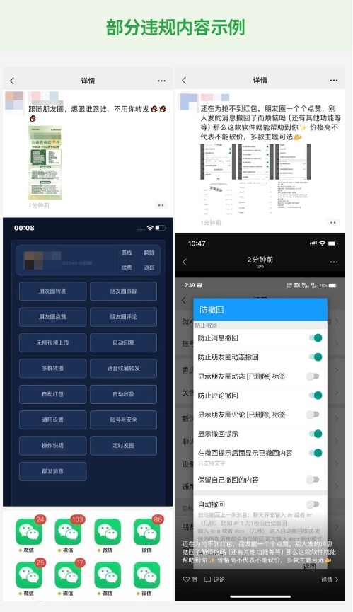 微信稱,上述行為一經(jīng)發(fā)現(xiàn)確認(rèn),將依據(jù)國(guó)家相關(guān)法律法規(guī)及《騰訊微信軟件許可及服務(wù)協(xié)議》《微信個(gè)人賬號(hào)使用規(guī)范》 ,根據(jù)違規(guī)嚴(yán)重程度進(jìn)行階梯式處理;對(duì)于多次違規(guī)者,將加重處罰。