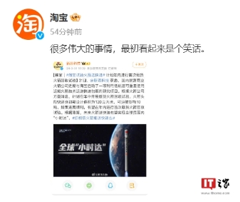 箭元科技近日宣布與淘寶開展火箭試驗,未來有望全球范圍內“小時達”,引發網友熱議。面對質疑,淘寶官方回應稱:“很多偉大的事情,最初看起來是個笑話”。