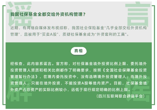 針對“我國社保基金全都交給外資機構管理”,四川互聯網聯合辟謠平臺回應:官方稱,對社保基金境外投資比例上限、委托境外投資管理人資質和相關比例都作了明確要求,按照《全國社會保障基金投資管理暫行辦法》,在境內委托投資中,沒有選聘境外投資管理人;而境外投資管理人,只能在境外投資,不能投資 A 股等境內資產。目前,社保基金境外資產占總資產的實際比例較小,遠低于現行規(guī)定明確的比例上限。