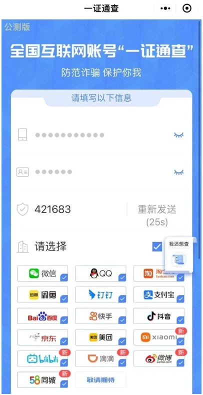 其中,互聯網賬號覆蓋了微信、淘寶、支付寶等16個平臺,提交申請后會在48小時內通過短信發送結果。