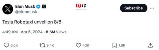 而馬斯克在 X 平臺上發文聲稱,特斯拉計劃 8 月 8 日推出相關“全自動駕駛載具”—— 無人駕駛出租車(Robotaxi)。