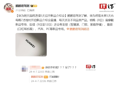 明晚(8 日)是穿戴新品專場,后續(9 日至 12 日)還會有全屋(智慧屏、門鎖、家庭存儲)、音頻(口紅耳機等)、汽車、PC 等新品專場。至于華為 P70 系列何時登場,該博主并未透露,只是表示“可能隨時”。
