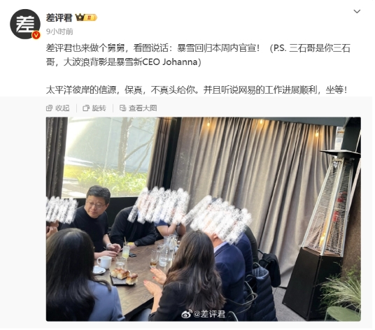 據(jù)差評(píng)君獲得的照片,網(wǎng)易 CEO 丁磊和暴雪新 CEO Johanna Faries 會(huì)面。該博主還表示“暴雪回歸本周內(nèi)官宣”。