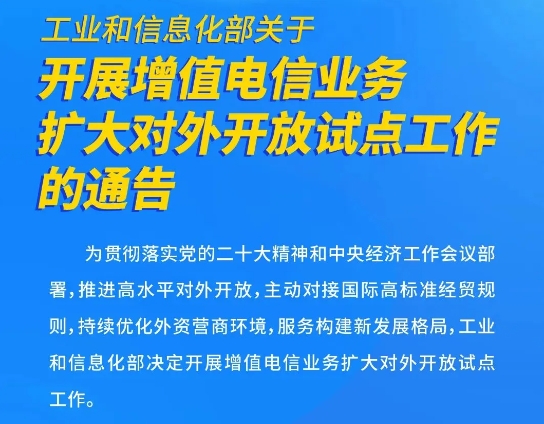 工業(yè)和信息化部近日發(fā)布通告,部署開(kāi)展增值電信業(yè)務(wù)擴(kuò)大對(duì)外開(kāi)放試點(diǎn)工作。