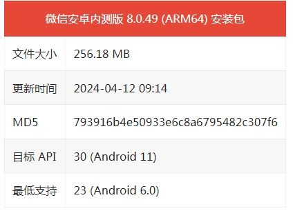 微信安卓平臺迎來了 8.0.49 測試版更新,本次更新安裝包文件詳細信息如下: