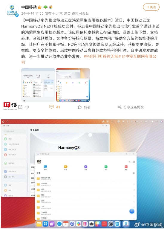 據“中國移動”官方微博,中國移動近日推出華為鴻蒙 HarmonyOS NEXT 版“移動云盤” 原生 App,標志著“中國移動率先推出電信行業首個通過測試的鴻蒙原生應用核心版本”。