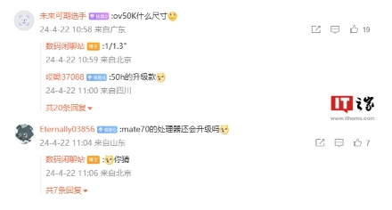 有網(wǎng)友在評(píng)論區(qū)中詢問(wèn)“OV50K 什么尺寸?”,博主回復(fù)“1/1.3”。此外,還有網(wǎng)友詢問(wèn)“Mate 70 的處理器還會(huì)升級(jí)嗎?”,博主附狗頭表情并表示“你猜”,暗示 Mate 70 系列手機(jī)將在處理器部分進(jìn)行升級(jí)。