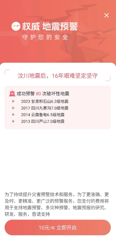 “地震預警”App 是“四川成都高新減災研究所”推出的一款災害資訊速報應用,這款應用安卓版本近日更新 9.0.0 版,主要加入了預警功能訂閱,訂閱價格為 10 元 / 年。