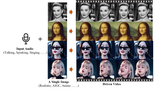 音頻驅(qū)動的視頻生成:EMO 能夠根據(jù)輸入的音頻(如說話或唱歌)直接生成視頻,無需依賴于預(yù)先錄制的視頻片段或 3D 面部模型。