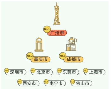 全國消費(fèi)熱度 TOP10 城市依次為廣州、重慶、成都、深圳、北京、東莞、上海、西安、南寧、佛山。