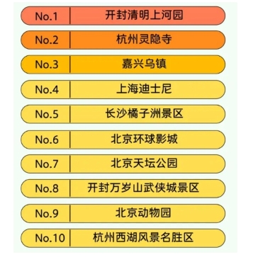 全國熱門景區(qū) TOP10:開封清明上河園、杭州靈隱寺、嘉興烏鎮(zhèn)、上海迪士尼、長沙橘子洲景區(qū)、北京環(huán)球影城、北京天壇公園、開封萬歲山武俠城景區(qū)、北京動物園、杭州西湖風(fēng)景名勝區(qū)。