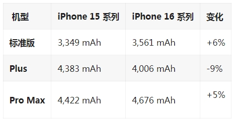iPhone 16 系列機型的電池容量將迎來調整。其中,標準版由上一代的 3349 mAh 增加到 3561 mAh;Plus 版由上一代的 4383 mAh 減低到 4006 mAh;Pro Max 版由上一代的 4422 mAh 增加到 4676 mAh。