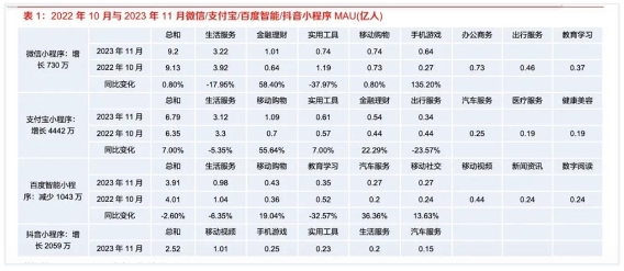 根據(jù) Questmobile 數(shù)據(jù),截至2023年11月,全網(wǎng)用戶月人均使用小程序個數(shù)同比上升5.0%,APP個數(shù)同比下降0.2%。