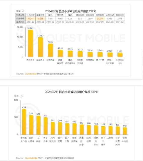 QuestMobile數(shù)據(jù)顯示,2024年2月,小游戲市場迅速增長,例如,微信小程序游戲活躍用戶達(dá)7.5億,在全景流量中占比達(dá)80.3%。微信曾給出相關(guān)數(shù)據(jù),2023年微信小游戲廣告消耗增長30%,商業(yè)規(guī)模增長超過50%。而三七互娛旗下的尋道大千活躍用戶規(guī)模超過1.6億。