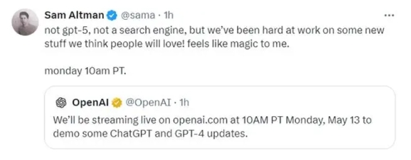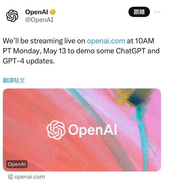 OpenAI 日前宣布,將于太平洋時間 5 月 13 日 10:00 (注:北京時間 5 月 14 日凌晨 1:00)網絡直播一些關于 ChatGPT 的升級內容。