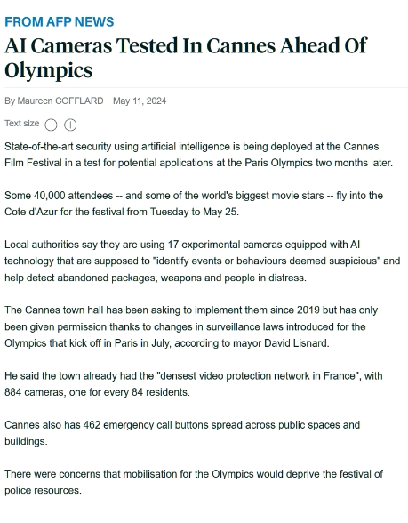 為巴黎奧運(yùn)安保“鋪路”,戛納電影節(jié)將部署可識(shí)別可疑行為的 AI 攝像頭 09:13:51