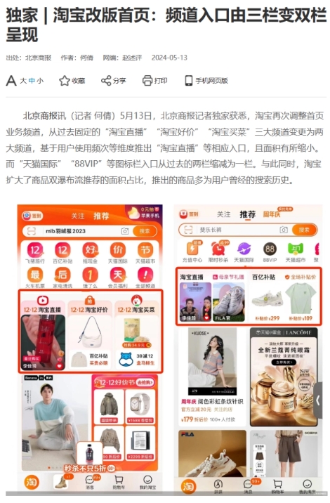 北京商報報道稱,淘寶內部人士表示目前淘寶 App 首頁會根據用戶日常使用習慣、用戶所在區域等因素進行動態調整,以提升淘寶首頁對用戶匹配的精準度,這導致不同用戶的淘寶首頁會有所不同。