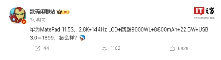 博主 @數(shù)碼閑聊站 今日發(fā)布微博“華為 MatePad 11.5S,2.8K+144Hz LCD + 麒麟 9000WL+8800mAh+22.5W+USB 3.0=1899”。