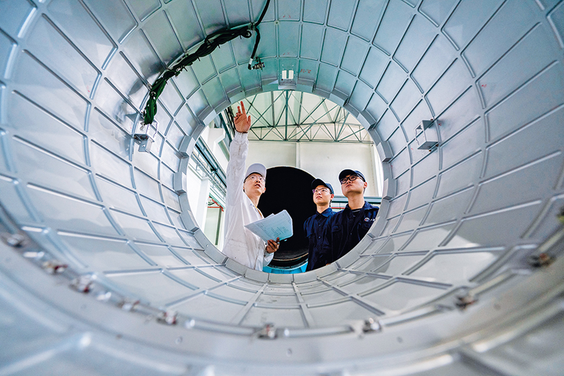 航天科工火箭技術有限公司快舟火箭結構設計師(左)與裝配人員討論火箭艙段裝配要點(2024年6月3日攝) 胡競文攝/本刊