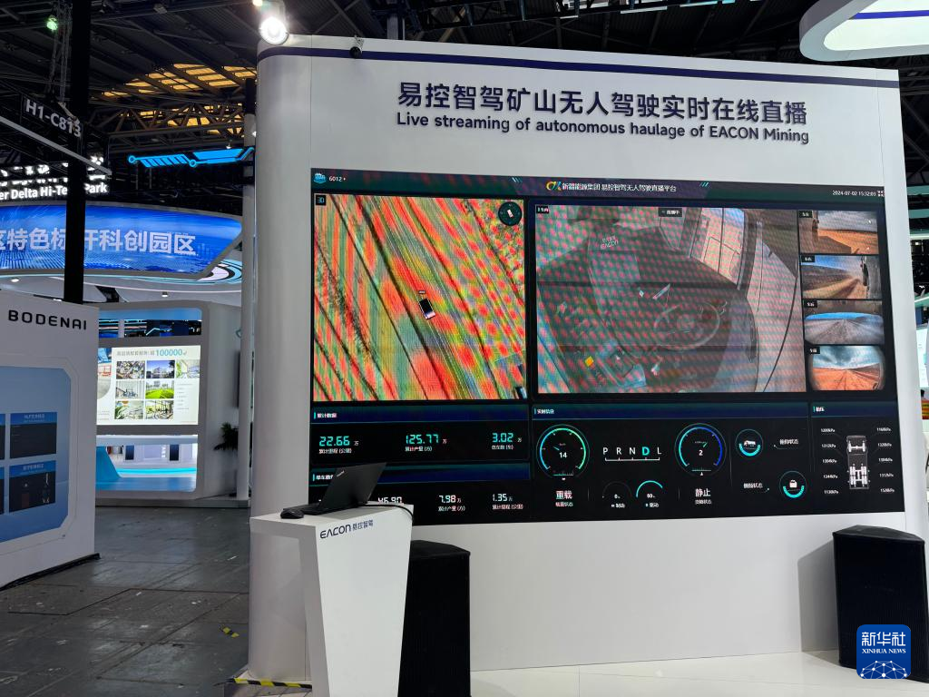 展廳的另一處,易控智駕正在實時直播國內一大型露天煤礦無人作業情況。現場工作人員介紹,在國家電投內蒙古公司南露天煤礦,自卸車無人駕駛運輸項目已安全平穩地運行了半年多,不僅可進行24小時連續作業,還曾創下單日最高產量2.18萬立方米的紀錄。