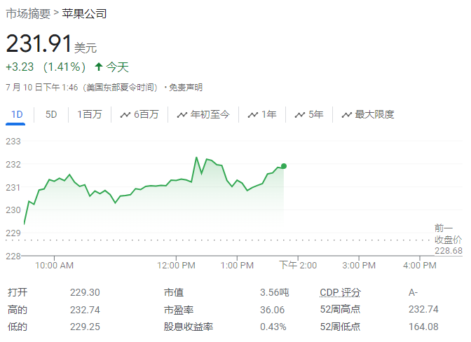 此消息公布后,蘋果股價一度上漲1.8%至232.74美元,刷新盤中新高。截至周二收盤,該股今年已累漲19%。