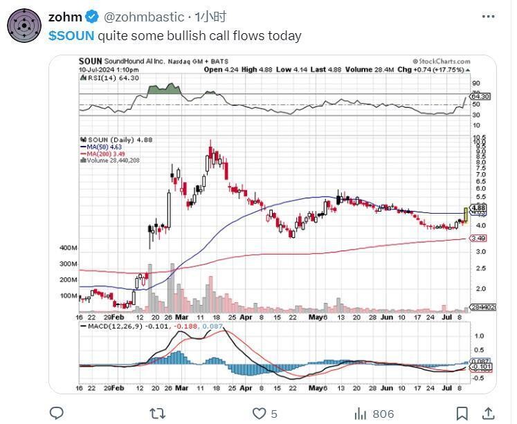 有社交媒體的網友熱評SoundHound大漲稱,周三SoundHound有很多看漲信號,還有人稱,該個股有望突破上行通道。