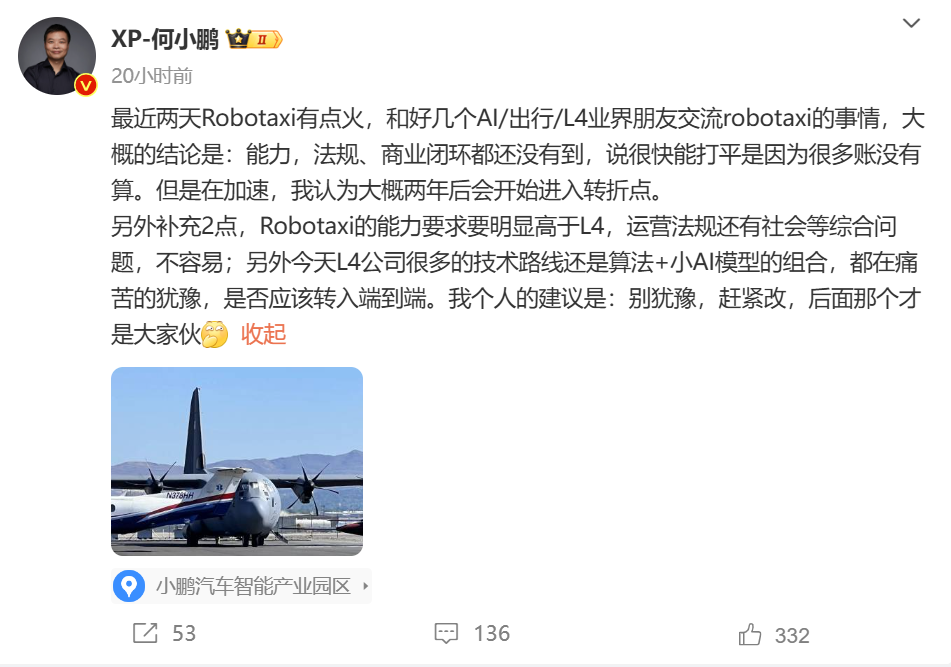 小鵬汽車董事長何小鵬近期在微博上發(fā)表觀點(diǎn),預(yù)測Robotaxi將在兩年后迎來轉(zhuǎn)折點(diǎn)。他指出,盡管目前Robotaxi在技術(shù)能力、法規(guī)和商業(yè)閉環(huán)方面尚未完全成熟,但發(fā)展速度正在加快。何小鵬特別強(qiáng)調(diào)了端到端技術(shù)路線的重要性,認(rèn)為這將是推動(dòng)自動(dòng)駕駛技術(shù)發(fā)展的關(guān)鍵。