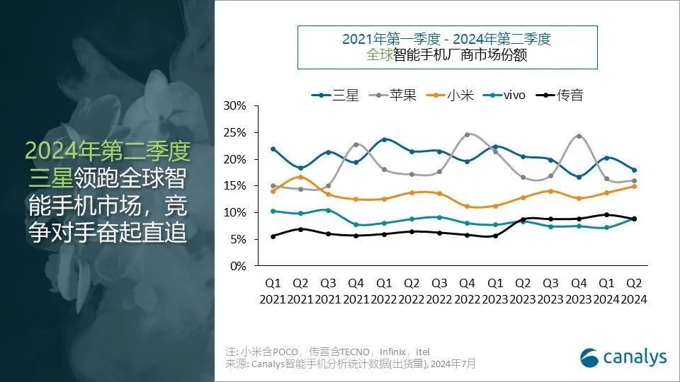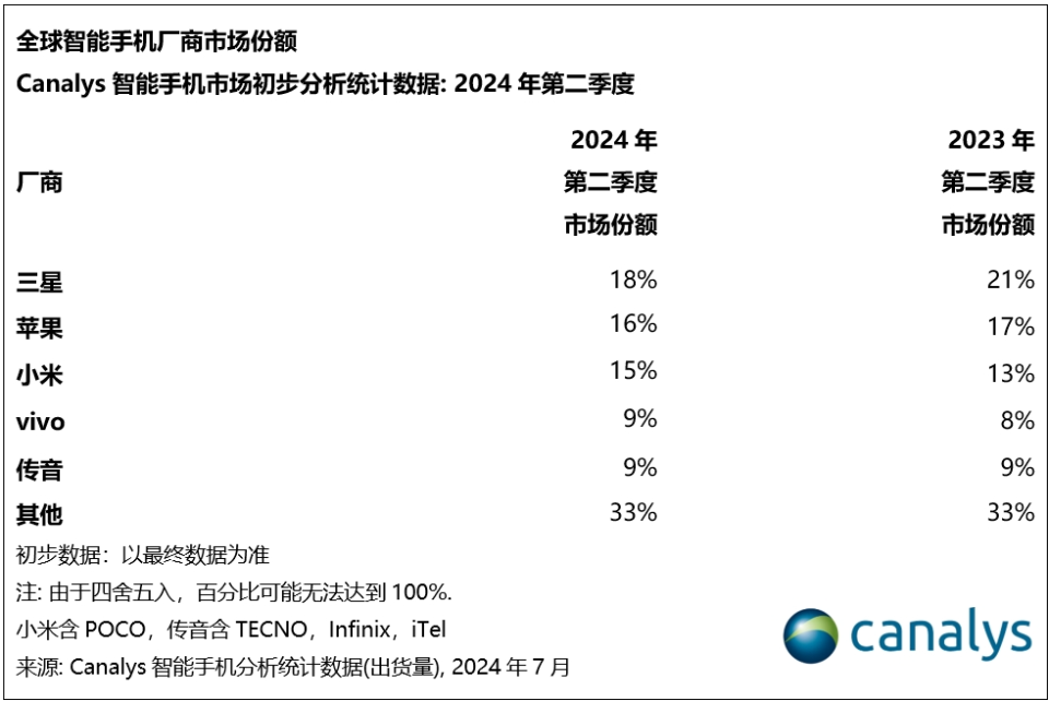 Canalys 研究經理劉藝璇(Amber Liu)表示:“在生成式人工智能(GenAI)等創新技術和大眾市場需求復蘇的推動下,全球智能手機市場的樂觀情緒持續上升。自 2024 年初以來,亞太、中東、非洲和拉美新興市場的通脹緩解,刺激了大眾市場價位段出貨量的增長。包括小米和傳音在內的廠商,正在積極推動產品升級,以抓住機遇。同時,由于國內市場的競爭日趨白熱化,榮耀、OPPO 和 vivo 則在今年集中精力向中國大陸以外的國際市場擴張。”