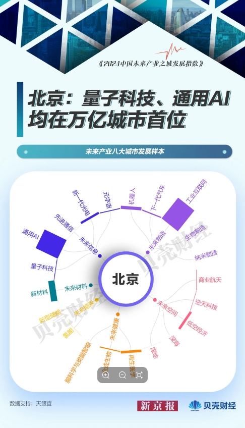 北京擁有中國一半以上的院士、一半以上的最好學科、一半以上的世界五百強企業,還有眾多獨角獸企業,是國際科技創新中心。2024年北京市政府工作報告中提到,北京已出臺了一批推動戰略新興產業和未來產業發展的政策,形成了新一代信息技術和科技服務業2個萬億元級產業集群,醫藥健康、智能裝備、人工智能、節能環保、集成電路等5個千億元級產業集群,類腦智能、量子信息、未來空天技術等未來產業也初具規模,為發展新質生產力夯實了產業基礎。