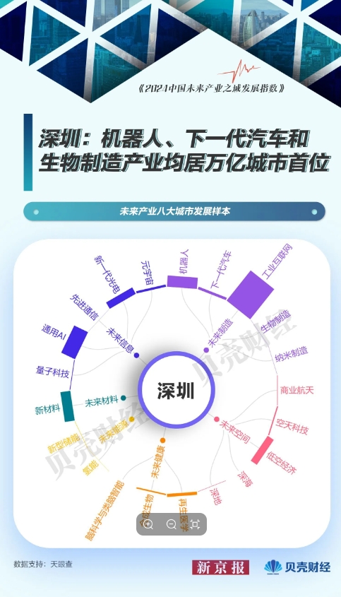 7月9日,在“中國經濟向新而行”夏季峰會深圳分論壇“新質生產力下的中國智造”中,新京報貝殼財經首次發布《2024中國未來產業之城發展指數》報告(以下簡稱《報告》)。在清華大學二十國集團(G20)創業研究中心的指導下,推出“2024中國未來產業之城發展指數”,通過梳理六大未來產業方向中初具規模的21個產業共710萬余條企業數據,對32個萬億GDP城市及準萬億GDP城市的未來產業發展程度進行評價,綜合城市政策、科研基礎等,挖掘城市未來產業發展潛力。