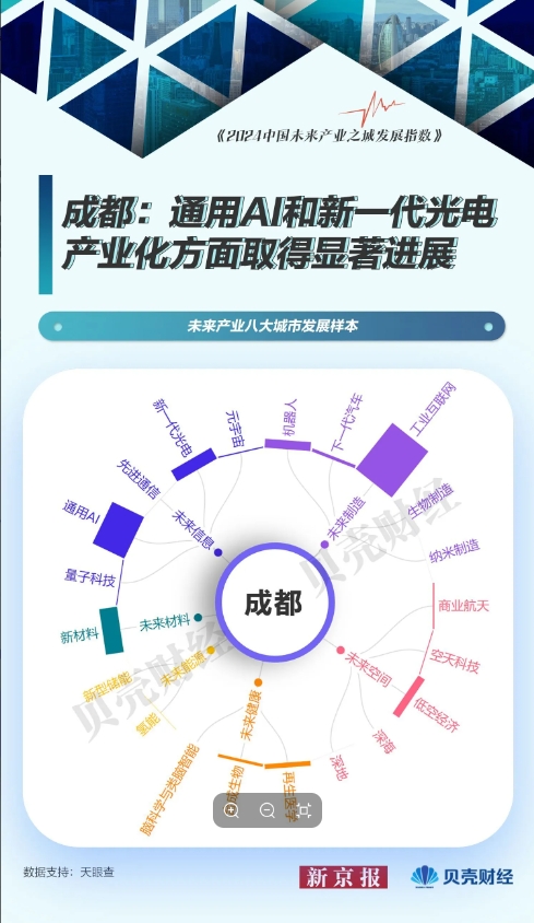 2024年1月,成都市政府出臺《關于前瞻培育未來產業構筑高質量發展新動能的實施意見》和《關于前瞻培育未來產業的政策措施》,明確了未來產業的戰略定位和發展方向。未來產業之城發展指數的產業維度綜合評價,成都排在第五,在未來信息方面相對優勢高于其他方向的未來產業。