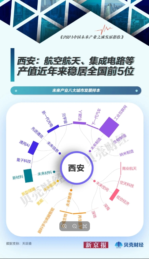作為“西北第一城”,西安產業基礎雄厚,優勢產業航空航天、集成電路等產值近年來穩居全國前五;新一代信息技術、汽車制造產業集群進入千億元級方陣。但由于西安周邊地市的經濟發展較不平衡,在產業形成和集聚方面存在一定局限性。針對當地產業特性,據《西安市“十四五”產業發展規劃》,到2025年,西安將基本形成“6+5+6+1”現代產業體系;2024年西安市政府工作報告還提出,要加強未來產業規劃和政策引導,爭創未來產業先導區。未來產業之城發展指數產業維度綜合評價,西安總分排在第七,在未來信息、未來空間、未來材料方面相對占優勢。
