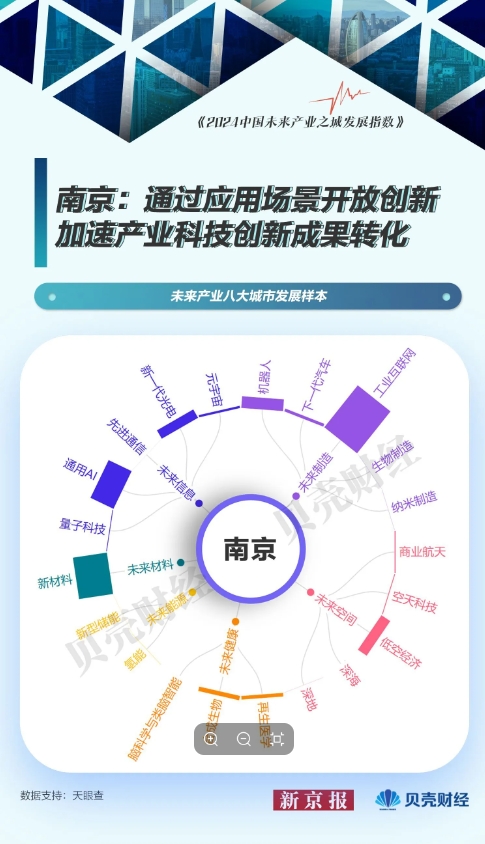 南京積極布局未來產業,2023年1月發布《南京市加快發展未來產業六大專項行動計劃》,并通過應用場景開放創新,加速產業科技創新成果轉化,累計對外發布應用場景超4000個,其開放合作模式得到廣泛認可。未來產業之城發展指數的產業維度綜合評價,南京總分排在第八,在未來信息、未來空間、未來健康、未來材料的部分產業上具有相對優勢。
