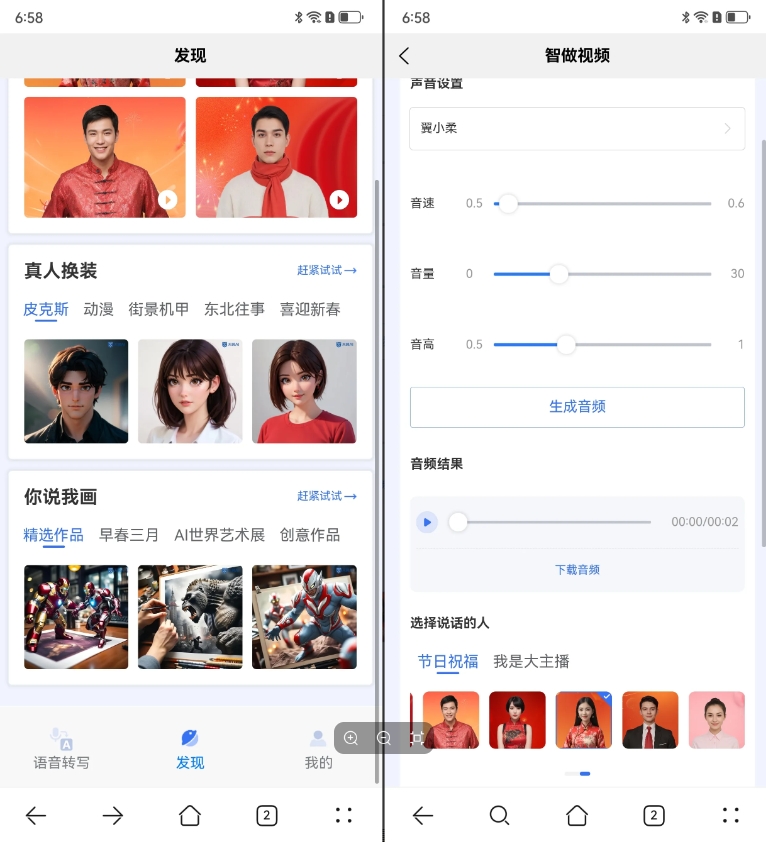 小雷簡(jiǎn)單體驗(yàn)了一下視頻生成功能,你可以根據(jù)自己的需求設(shè)置虛擬主播的播報(bào)內(nèi)容,也可以選擇不同的語(yǔ)速、音色、形象等。雖說(shuō)整體的效果還是有一些生硬,但對(duì)于很多老年人來(lái)說(shuō),如此簡(jiǎn)單的操作已經(jīng)能夠滿(mǎn)足他們的需求。