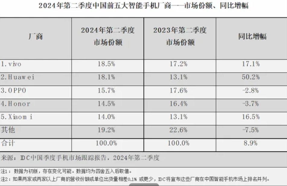2024 年第二季度,中國(guó)大陸智能手機(jī)市場(chǎng)在經(jīng)歷上一季度的回暖拐點(diǎn)后實(shí)現(xiàn)進(jìn)一步復(fù)蘇。并且,中國(guó)本土廠商首次包攬前五席。