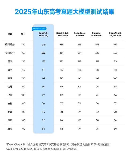 6月26日上午消息,日前,字節跳動Seed團隊公布2025高考全科測試結果。該測試采用全國新一卷和山東省自主命題,豆包Seed1.6-Thinking模型的文科和理科成績分別達到683分和648分。在同期測試的國內外5款頂級模型中,豆包文科成績獲最高分,理科僅次于谷歌Gemini 2.5 Pro,后者成績為655分。