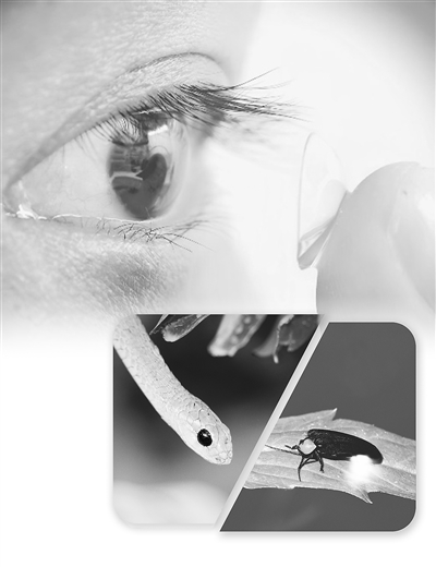 ①圖為上轉換隱形眼鏡。佩戴它后,人類有望突破視覺限制,“看見”蛇、螢火蟲等動物眼中的世界。受訪單位供圖